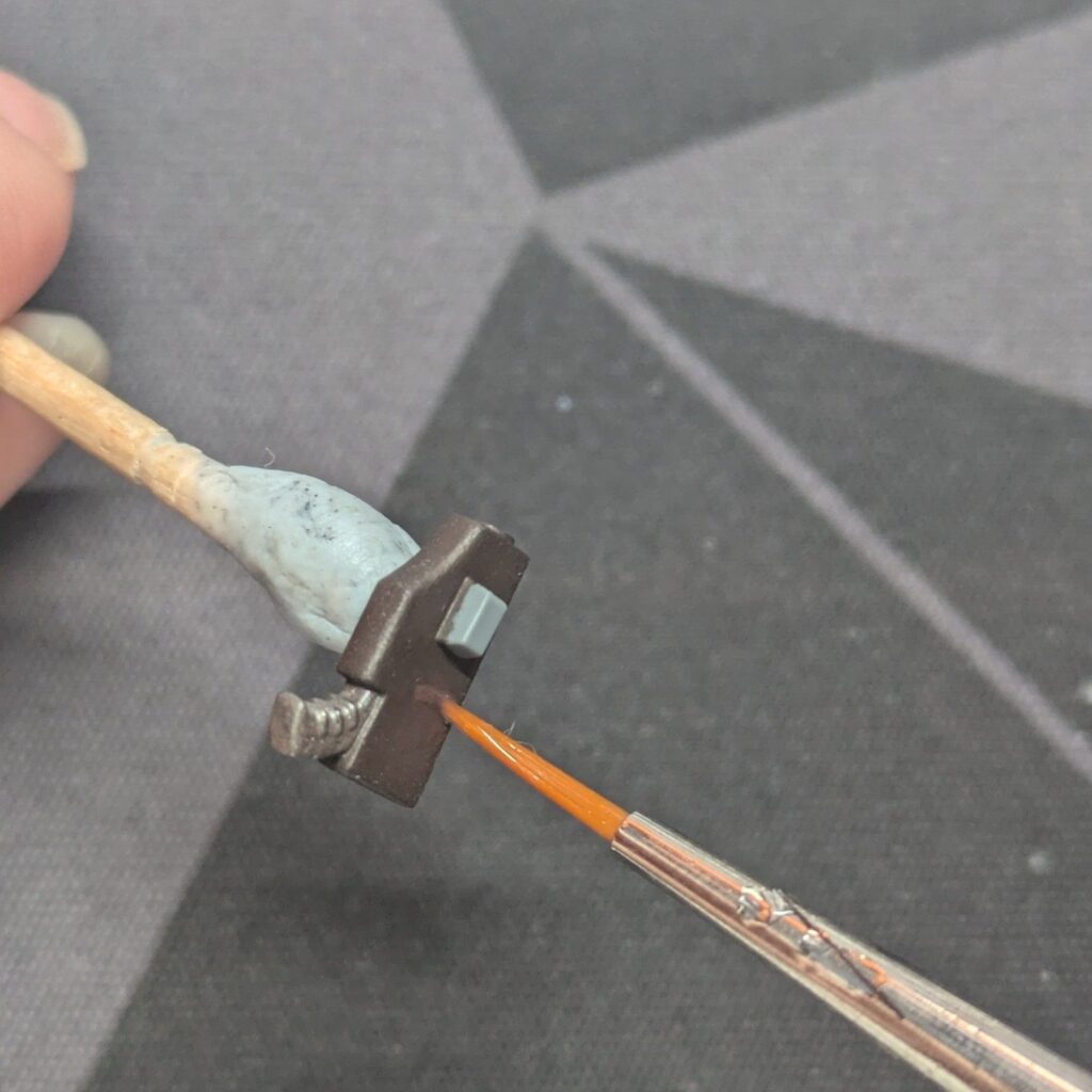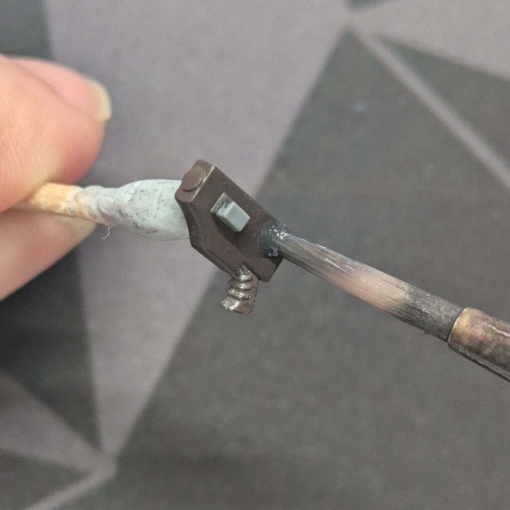 金属の重厚感と光沢が出る。武器・機械パーツ全般に使える。Agrax Earthshadeにすると錆びも表現できる。